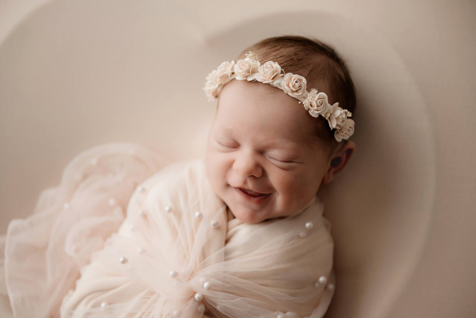 Everything needed to photograph your baby is already here in the studio: wraps, bonnets, headbands, backgrounds, and a full collection of newborn props and textures that photograph beautifully and hold up well over time.