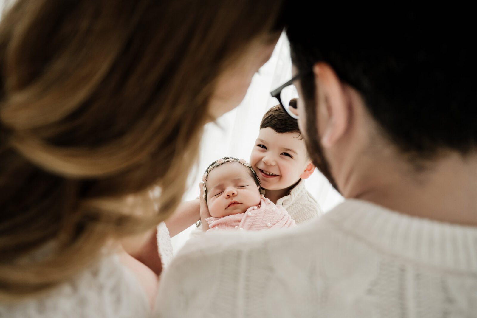 If your baby is older than three weeks, many babies become more sensitive to being posed, and they often settle most naturally in their parents’ arms. That is why I usually recommend the Baby In Your Arms Studio Session for older newborns.